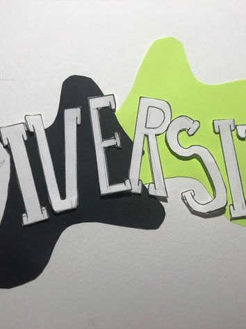 Above is my final version of my creative word, diversity. The font I pick is modified from the hollow "Impact". I added some "ears" to the original font to make the word look more funky and different. I wrote each letter out on a white cardboard paper, then I cut them out and arrange them levelled. I drew to black people on the letter D and R. They are the highlight of this artwork. They welcome the audience of this drawing to be more diverse in the way they want to. At the back of the word, there are two colour blocks, a black one and a neon yellow one. They are exactly the same size, but they are placed oppose to each other. I think sometimes diversity is when different elements clash together to form a mutual relationship. That is why I carved to blocks from my colour papers.